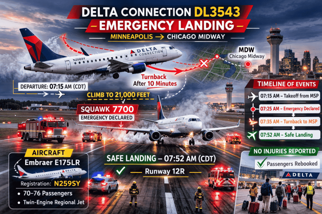 Air travel remains one of the safest modes of transportation, but when news breaks that an aircraft has declared an emergency, passengers understandably want answers. The Delta Connection DL3543 emergency landing is one such event that quickly drew attention among aviation watchers and travellers alike. In this comprehensive report, we break down everything currently known about the Delta Connection flight DL3543 emergency landing, including the flight route, aircraft type, timeline of events, what an emergency declaration means, and how situations like this are typically handled in commercial aviation.