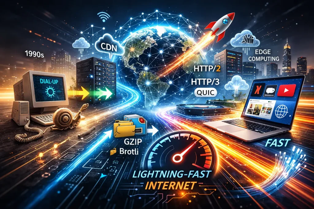 The internet has evolved dramatically since the early days of dial-up connections and slow-loading websites. In the 1990s, opening a single webpage could take several seconds—or even minutes—because technology was still developing. Over time, several groundbreaking innovations transformed how data moves across the internet, making websites load faster and digital experiences smoother. Today, we enjoy lightning-fast browsing, instant streaming, and powerful web applications thanks to a series of tech ideas that made the web move quicker. These innovations improved network efficiency, reduced latency, optimized data delivery, and enhanced browser performance. The purpose of this article is to investigate the main technologies and concepts that accelerated the web and revolutionized online performance.